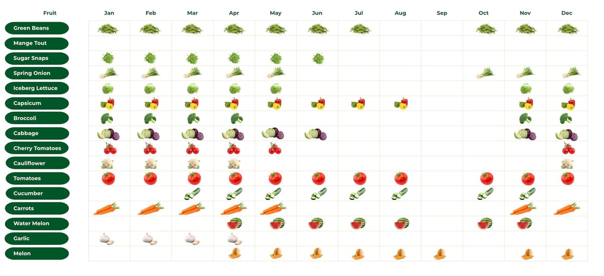 We update our catalogue seasonally to ensure you have access to the freshest produce at peak quality. Browse availability below to plan your orders efficiently: